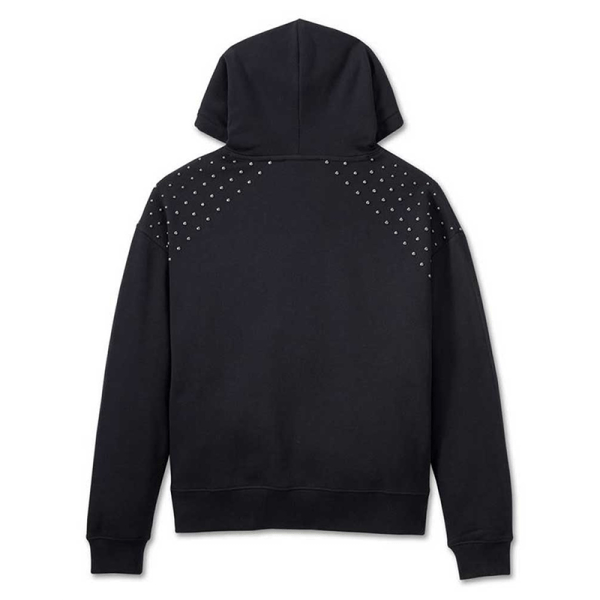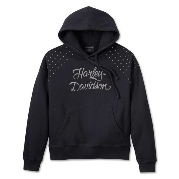 Harley-Davidson® Women’s Studded Out Pullover Hoodie – Black, 96570-24VW. Made from 100% cotton midweight sweatshirt fleece. Kangaroo pocket. Slightly oversized silhouette. Self-lined drawstring hood. Antique silver domed stud shoulder embellishment. Rib-knit cuffs and straight hem. Direct embroidery. 96570-24VW