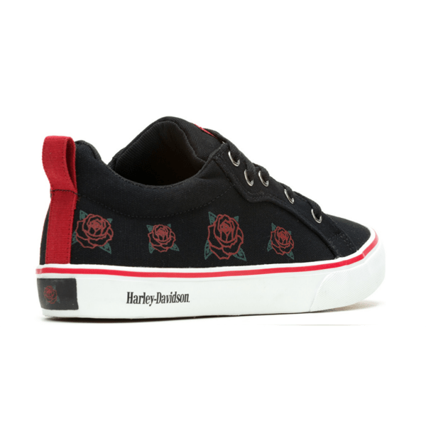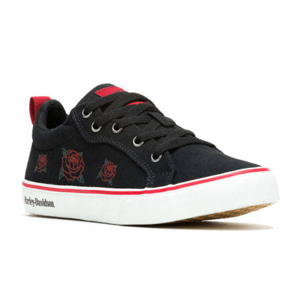 Harley-Davidson® Women’s Torland Black Vulcanized Canvas Sneakers, D84003. Feel comfortable and look iconic with this Torland canvas vulcanized sneaker with a signature red rose print and a rubber outsole. With a low profile, rubber outsoles, and a classic fabric Bar & Shield® logo on the tongue, these sneakers will take your street cred to the next level. With a padded cuff and tongue, traditional lacing and a canvas lining, all-day comfort is assured. The sneaker is trimmed in red, separating the uppers and the lowers. A matching red rose is on the backside of the heel. A red color-matched pull-on loop runs up the backside of the shaft. The street-side sole has cross-hatched tread elements for a sure footing, and a red Harley® logo is at the street-side heel area. The boot’s sole, insole and upper are bound using vulcanized processes, a proven technology that binds the upper, midsole, and sole components making for a sturdy and durable sneaker. The end result – these sneakers will last for years. Uptown, downtown, at work or play, these canvas sneakers will carry you in style and comfort. Shaft height: 2″, Heel height: 0.75″. Sizes US: M 5-10, 11. Manufacturer Part Number, D84003. Wolverine® and Harley-Davidson® have a long tradition of bringing original and functional footwear to our Motorcycle enthusiasts. Loyal. Tough. Fearless. Our Footwear embodies the spirit of the open road, as well as the men and women who proudly wear the name. With a growing global presence, Harley-Davidson® Footwear markets functional riding and Motorcycle footwear to anyone who seeks quality and values the Harley-Davidson® brand. Whether it’s performance or Motorcycle, we have what you need. Officially Licensed Harley-Davidson® Product by Wolverine®. These sneakers are not recommended for wear while riding a motorcycle.