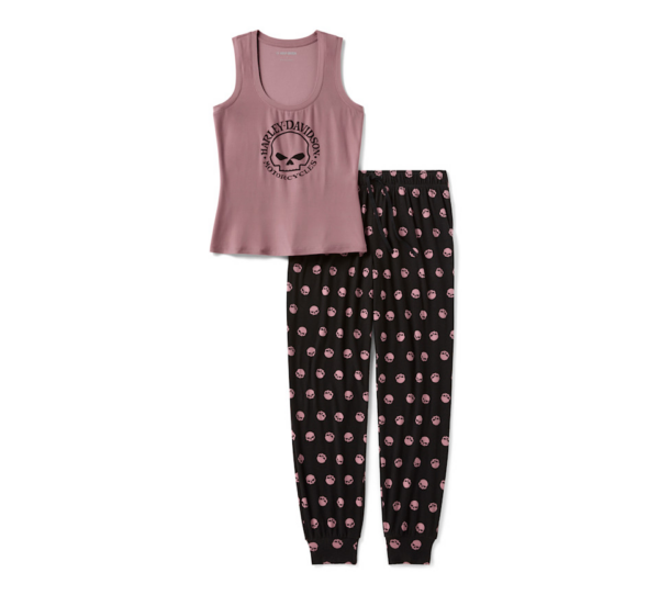 Lounge around and keep your moto-loving look in our Willie G™ Skull AOP Tank & Pant Set. Made for total comfort from soft polyester jersey with a hit of spandex for added stretch, these women’s pajamas feature a flattering scoop neckline, an elastic waistband with drawstring, and side seam pockets. This set is finished with a Willie G Skull lock-up design parked on the top and a custom allover print (AOP) on the pants. Though the iconic Skull is one of his most popular creations, Willie G. Davidson also designed several motorcycles, including the 1971 FX Super Glide® model and the 1977 FXS Low Rider® model.