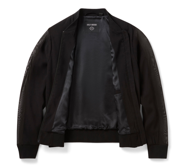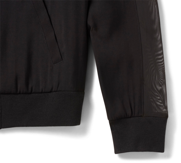 Bomber silhouette. Contrast, sheer mesh sleeve striping. Rib-knit collar, cuffs, and waistband. Locker loop.