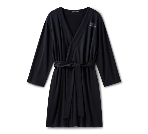 Add some shimmer to your lounge time in our Willie G™ Skull Bling Robe. Crafted from super soft polyester/spandex jersey to keep you comfy, this women’s robe features a Kimono collar, tie front, and side seam pockets. It’s stunningly finished with an all-rhinestone design spotlighting the iconic Willie G Skull. Know the history—though the Skull is one of his most popular creations, Willie G. Davidson also designed several motorcycles, including the 1971 FX Super Glide® model and the 1977 FXS Low Rider® model.