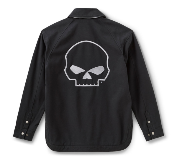 Comfort and protection for your every road ahead is here. Our latest Willie G® Skull Curved Hem Riding Jacket is cut from heavyweight cotton/polyester twill that’s tested and certified to meet abrasion, tear, and seam strength requirements. Its oversized fit delivers a more relaxed look that moves with you, plus it has ample pockets for securing essentials and a hidden snap-down collar that won’t flap around while you ride. This women’s motorcycling jacket includes D3O® Ghost™ armor in the shoulders and elbows for impact protection, and reflective material to enhance visibility. It’s finished with embroidered graphics hitting the front and filling the back. Bit of background—though the Skull showcased here is one of his most popular creations, Willie G. Davidson also designed several motorcycles, including the 1971 FX Super Glide® model and the 1977 FXS Low Rider® model. See all its specs below, then order yours now.