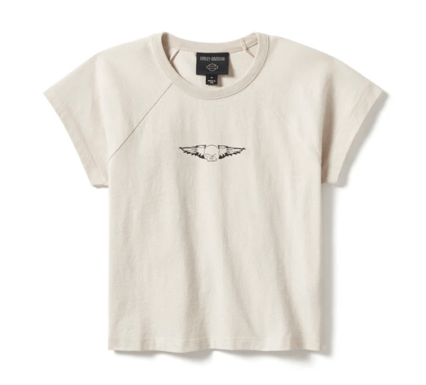 Shape-flattering style honors authentic artistry on the Willie G Wing Skull Sketch Art Baby Doll Tee. Its fitted, cropped silhouette is durably crafted from heavyweight cotton jersey thats enzyme washed for a well-worn look and feel. Finished with a Willie G original that merges elements of his beloved Skull with our 1930s Silver Wing logo. Part of the Willie G Sketch Collection of authentically made in USA garments that feature hand-drawn and signed artwork by our iconic designer, Willie G. Davidson.
