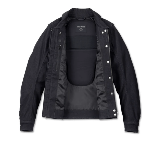 The look you love and the function you needits all here in our Chisel Denim Trucker Riding Jacket. Its abrasion-resistant build is cut from a mix of rugged Cordura nylon, cotton, and modal with a smooth polyester taffeta lining. Full of features like pre-curved sleeves, an action back, a back armor pocket, and plenty of secure pocket space for your essentials. Weve amped up its protection factor with D3O Ghost Armor in the shoulders and elbows. Stylishly, this next-level denim maintains its trucker jacket silhouette with a sleek, snap-tab collar and clean branding from a debossed leather patch.